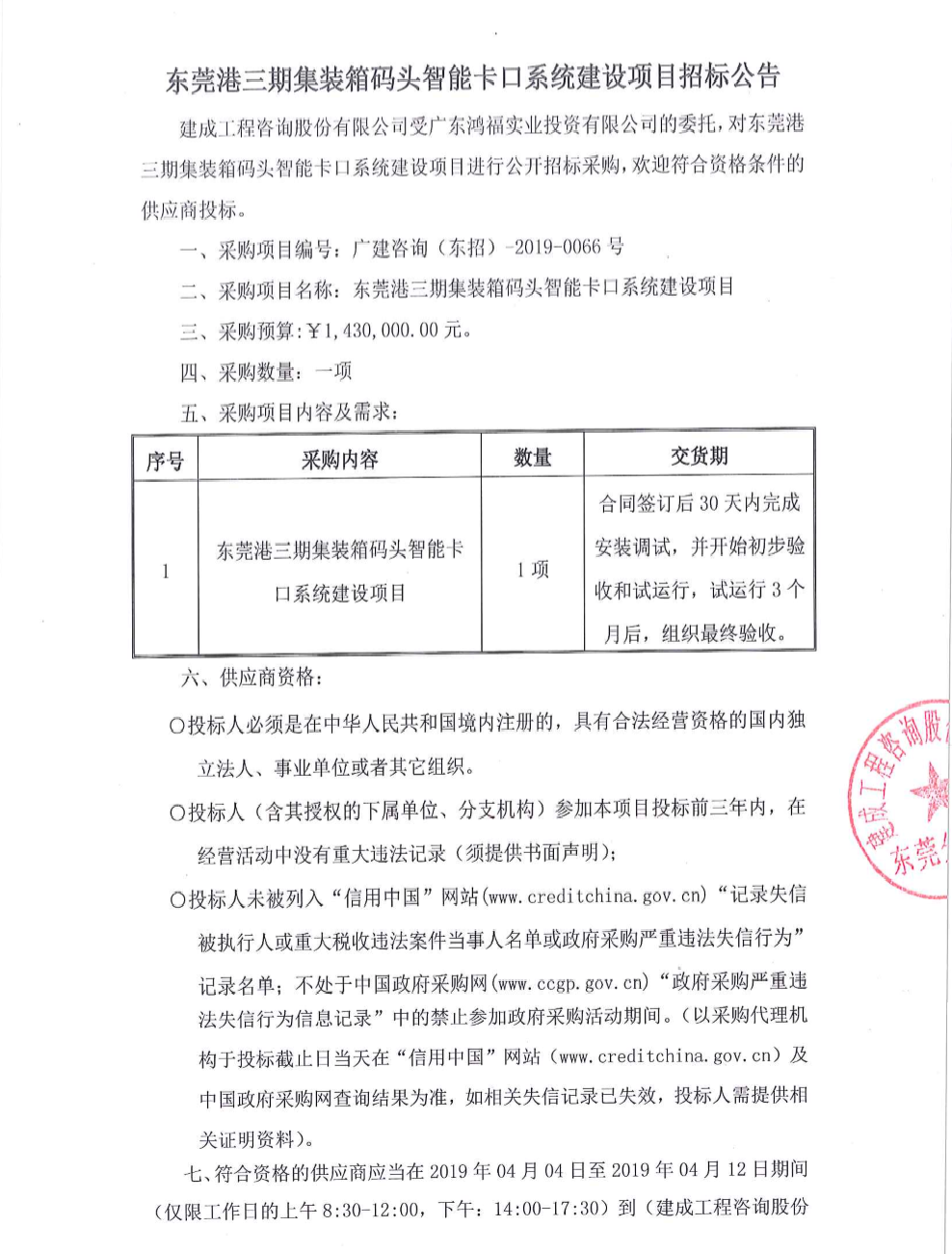 东莞港三期集装箱码头智能卡口系统建设项目招标公告