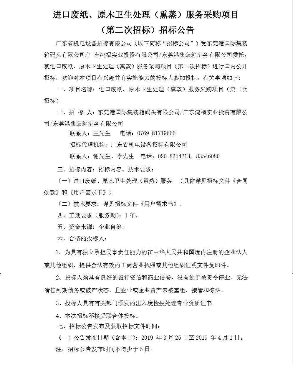 进口废纸、原木卫生处理(熏蒸)服务采购项目(二次招标)