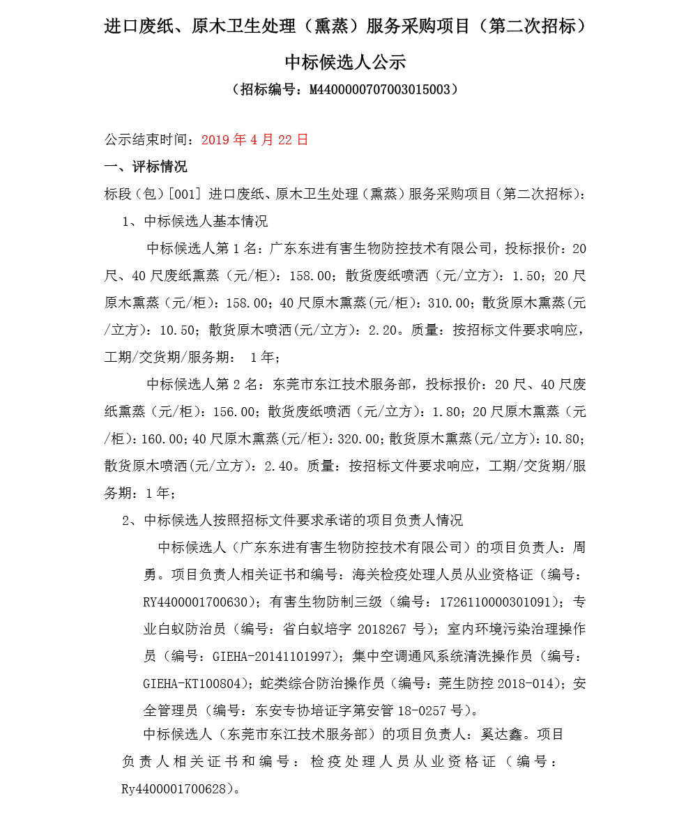 进口废纸、原木卫生处理(熏蒸)服务采购项目--中标候选人公示