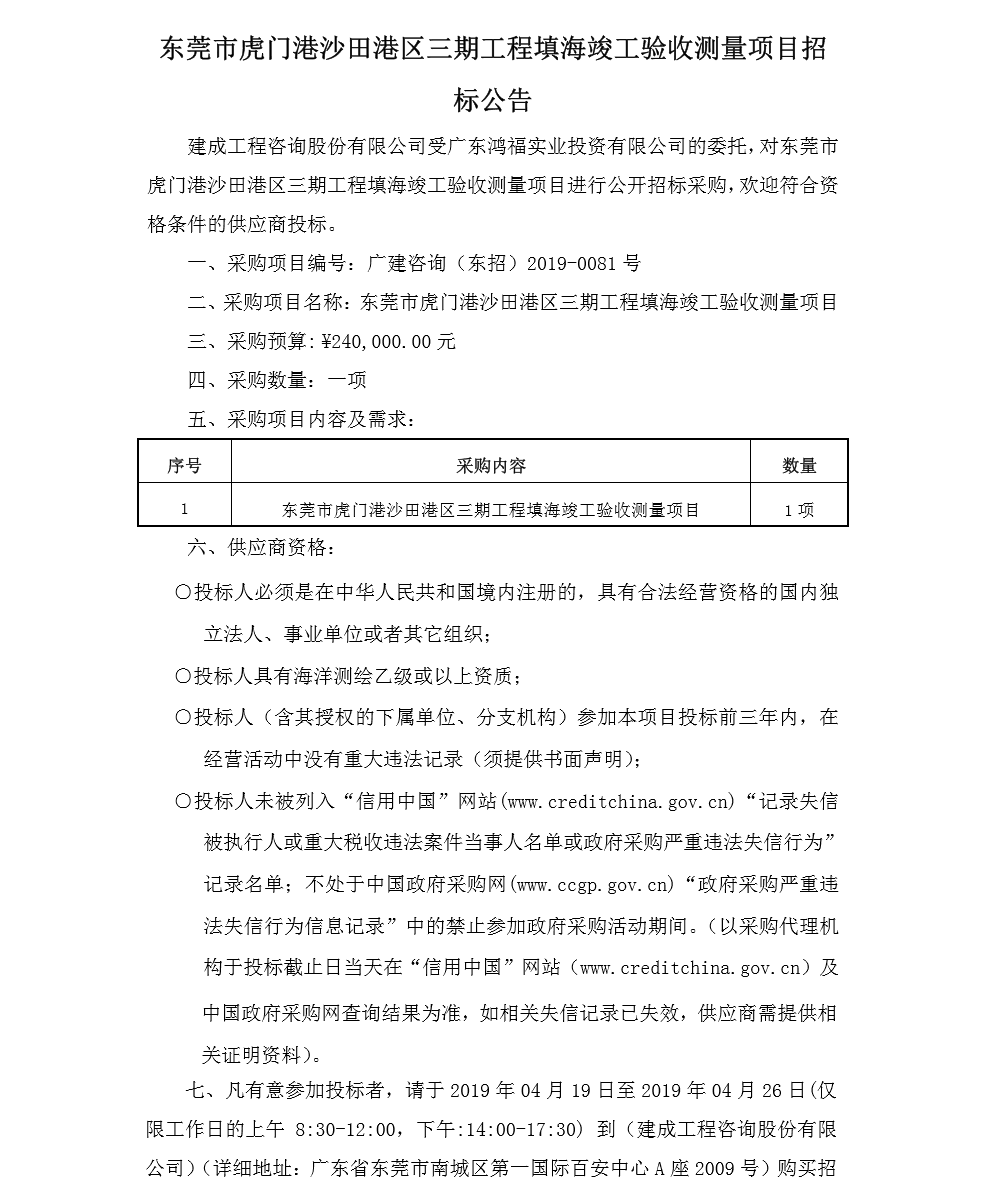 招标公告:东莞市虎门港沙田港区三期工程填海竣工验收测量项目