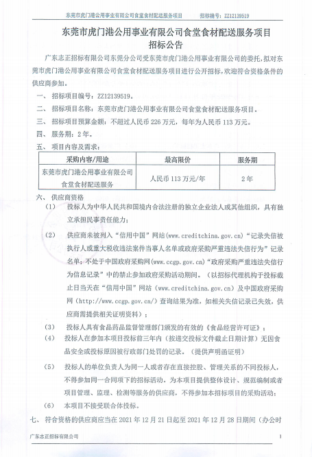 东莞市虎门港公用事业有限公司食堂食材配送服务项目招标公告