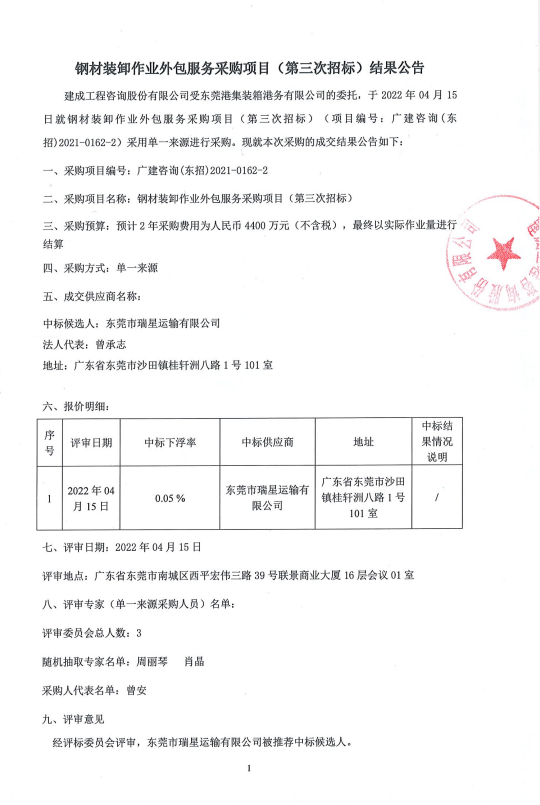 钢材装卸作业外包服务采购项目(第三次招标)结果公告